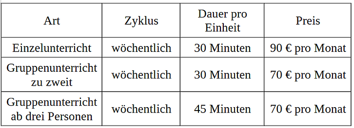 - Möchtet ihr gerne wöchentlich in einer Gruppe ab drei Personen teilnehmen, berechne ich 70 € im Monat für jeweils 45 Minuten Unterricht.
